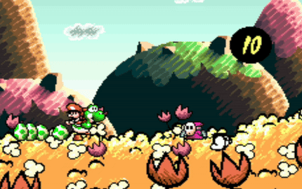 Starting in Super Mario World 2: Yoshi's Island, Yoshi would eat enemies to turn them into eggs and then aim and throw the eggs at other enemies. The eggs would fly straight, bouncing off walls and skimming across water. In Yoshi's Story, eggs stopped bouncing and instead exploded upon reaching the point of the aiming cursor; the size of the explosion was based on the Yoshi's happiness and color. Yoshi can carry six eggs at a time, though objects such as keys count towards the six slots.