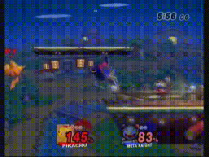 An example of a stage jump being performed during a match, showing Pikachu going under Smashville.