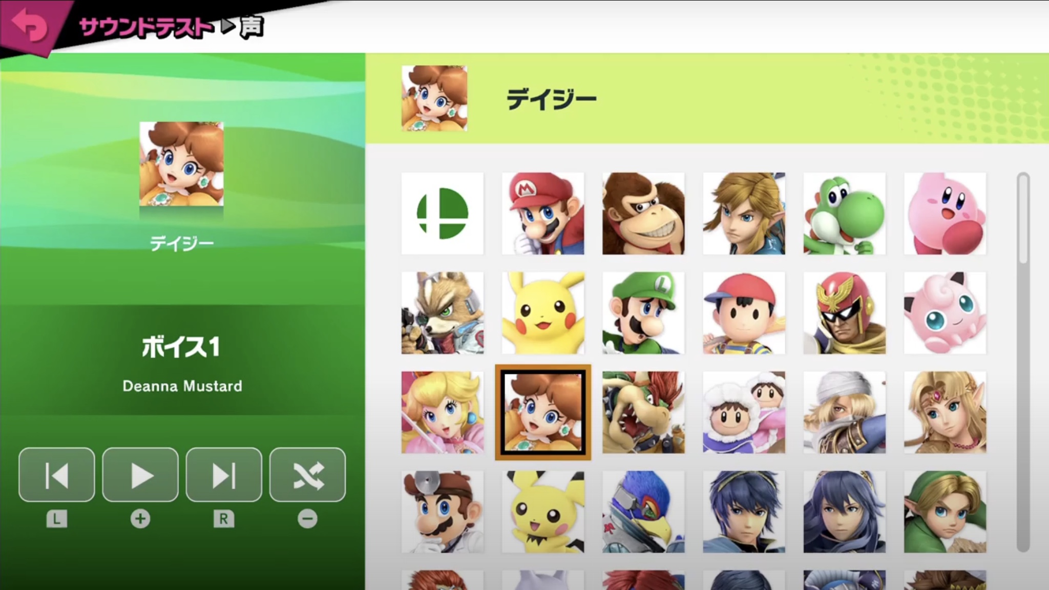 The Sound Test in Ultimate allowing the player to choose voice clips from a character; in this case, while Daisy is chosen as the character, but the player doesn't enter the voice selection screen, so the menu icons can still be controlled by the cursor.
