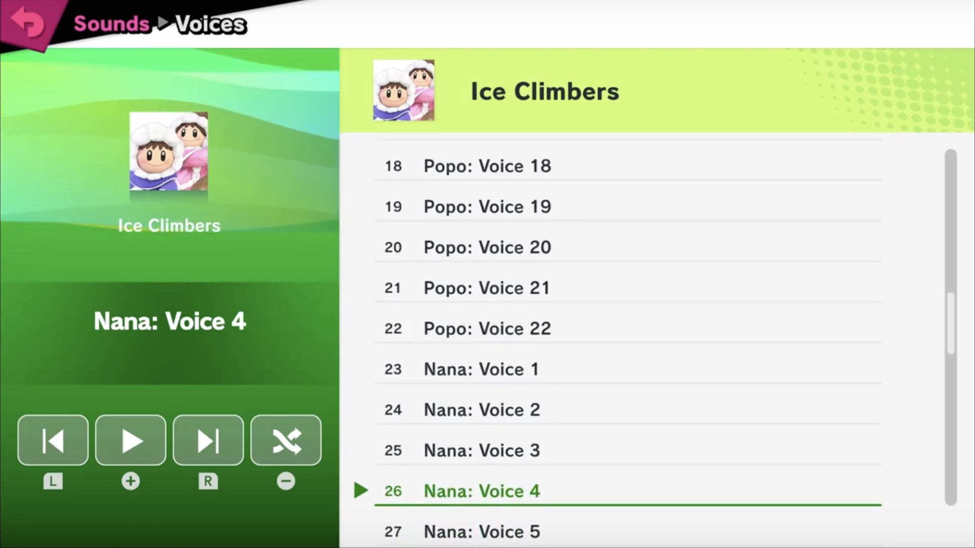 Sound Test section of the Ice Climbers in Super Smash Bros. Ultimate, demonstrating how multiple characters (in this case, Popo and Nana) appears in one section.