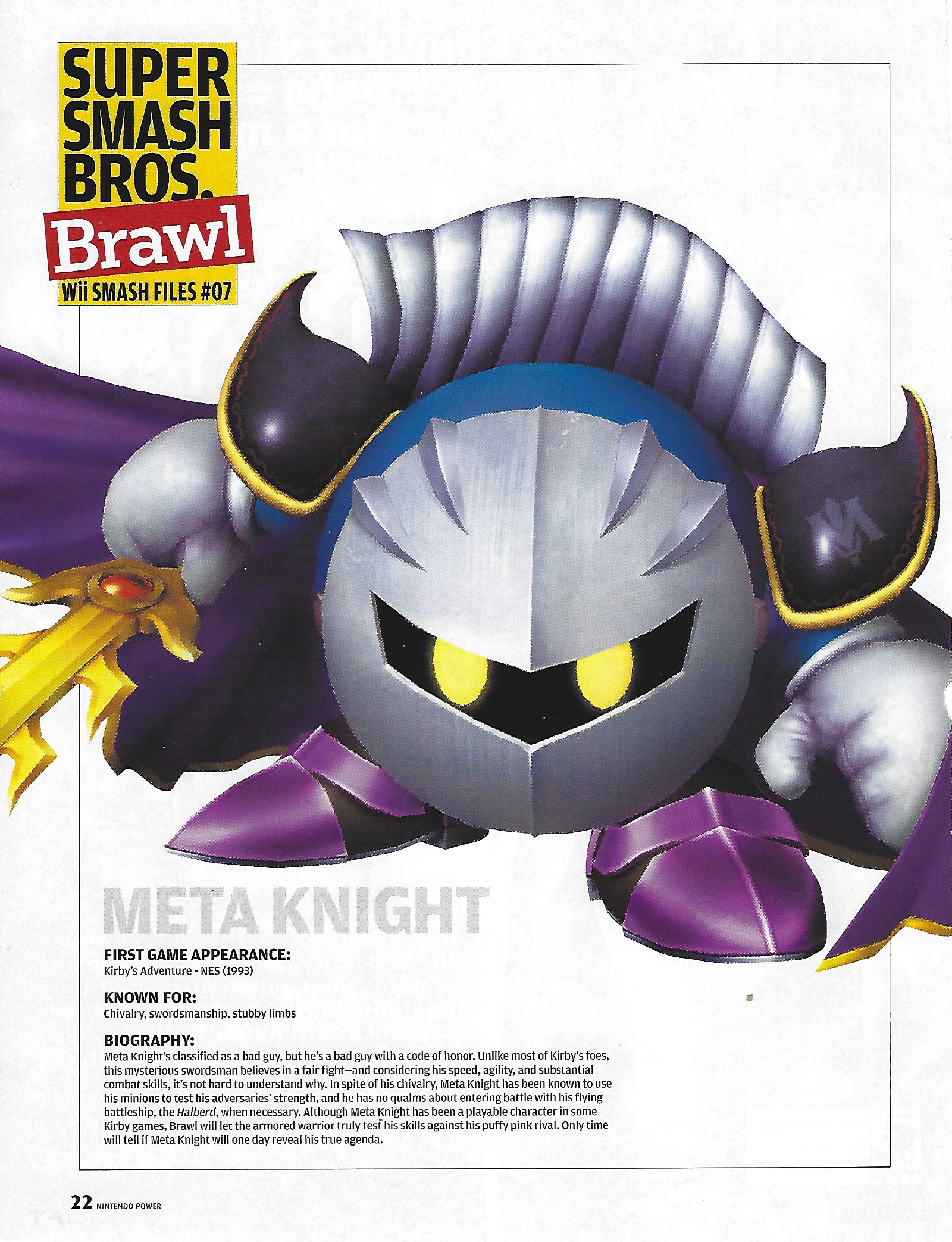 Scan of Smash Files #07 from volume 212 of Nintendo Power, featuring Meta Knight.