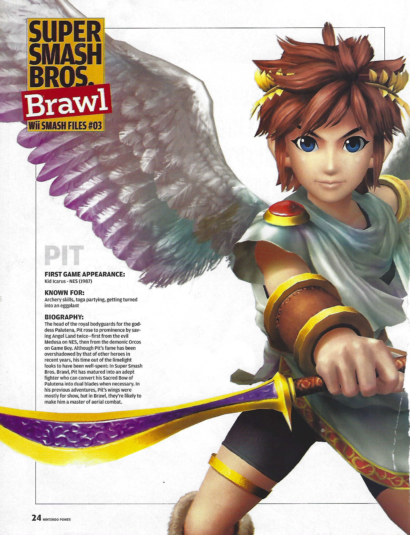 Scan of Smash Files #03 from volume 208 of Nintendo Power, featuring Pit.