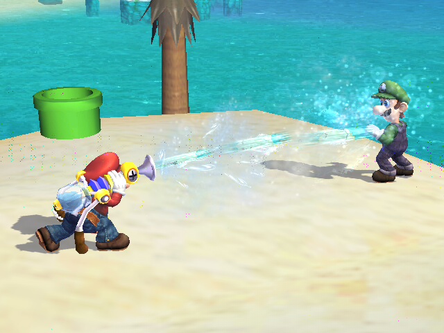 Mario using his F.L.U.D.D. against Luigi.