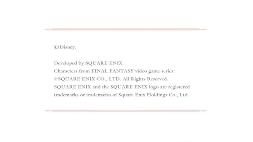 - At the beginning of when the Kingdom Hearts games start up, it says C Disney. Also C Disney/Pixar in KH3 and MoM. It also does the same for Final Fantasy but later changed to just "characters from Square Enix games". Other properties are only specified in certain installments, Tarzan in KH1 & FM, The Nightmare Before Christmas in the original KH2 and KH CoM, Peter Pan in KH CoM & Re:CoM (listing Pan, Tinkerbell, and Hook individually by name), and Winnie the Pooh in KH3. As well as licensed by Nintendo on any of their platforms, as well as any companies and engines that worked on that specific installment. And of course, developed by Square Enix. Just looking at anyone's LP on YouTube that includes the start up shows that. In fact, here's a picture of one of the start ups regarding the copyright. Wolff (talk) 09:12, October 27, 2021 (EDT)