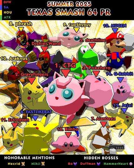 The Texas Power Rankings list the best Smashers in Texas. The first Super Smash Bros. for Wii U rankings were released on December 1st, 2016. DFW stands for Dallas & Fort Worth, the most active region.